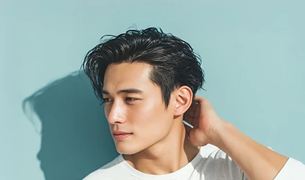 美容意識の高いエグゼクティブ男性を想定し、紺色をメインカラーに青いグラデーションで清潔感と信頼感あるデザインにしました。